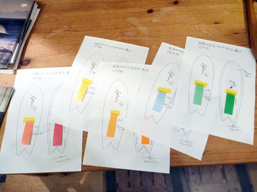 ニューモデルのフィッシュ。出来上がるのは新年になります。新春ということで、きれいな明るい色を選んでみました。いっせいにパドルアウトしたら楽しそうです。私はピンク担当かな 笑。