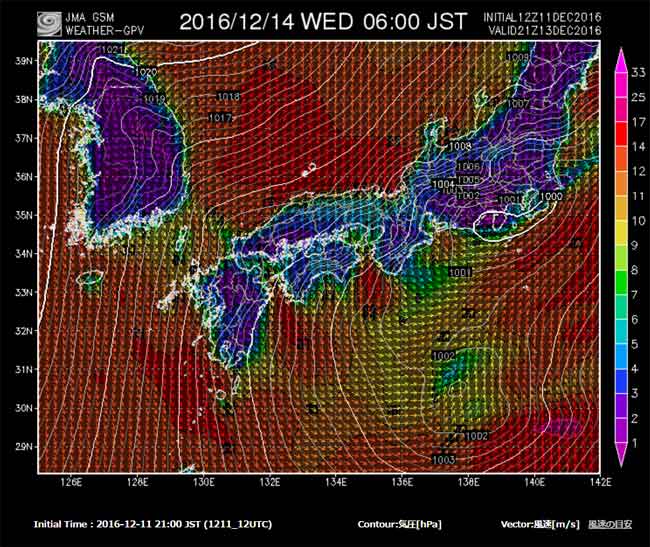 水曜日、朝の風の予想。低気圧の通過で波が上がりそうです。沿岸はオフの北風の予想です。波のサイズは北風の強弱次第ですね~。ファンウェイブ希望です。