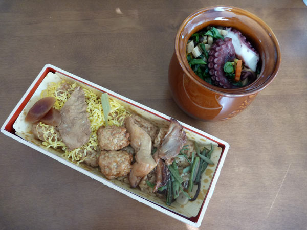 途中、農協の直売所で駅弁フェアをやっていたので、明石のひっぱりだこ弁当と名古屋コーチン弁当を買って帰って昼飯です。