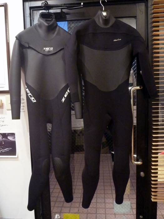 冬場に寒くないウェット、各メーカーいろいろと用意してます。身体に合わせて作りますのですぐにという訳にはいきませんが、時間がかかっても必要なものは用意しておきましょう(現在は年明けの出来上がりですが、それでも2、3月の一番水温と気温が低い時期には十分間に合います)