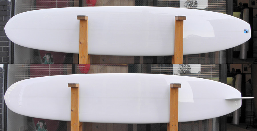 私のPIGです。フラットなロッカーでノーズコンケーブも入っていない丸太(ログ)ですが、このアウトラインのまま、ノーズライダーも作ることができます。