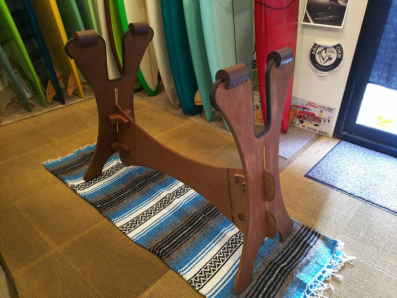 サーフボードラック、新調しました。昨年の秋にサーフボードのスペースを広げたのですが、ボードを取り出してチェックする台を作らなきゃなあと考えておりました。それで今週ようやく重すぎる腰をあげて製作に取り掛かろうと設計図を書いていたら、ネットでこれを発見。
