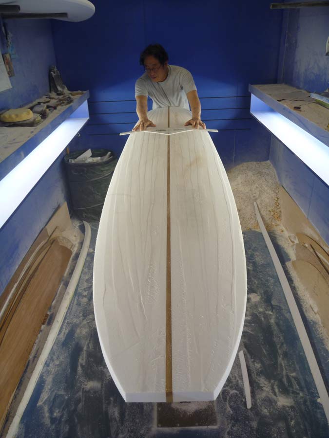 高密度発泡で、きめが細かくクラシックボードらしい、しっかりとした重量があるブランクスです。ストリンガーは、3/8インチのレッドシダー。ラミネートしてしまうと分からなくなりますが、シェイプ中は木材のいい香りが漂ってます。活さん、シェイプしながら香りに癒されてました。