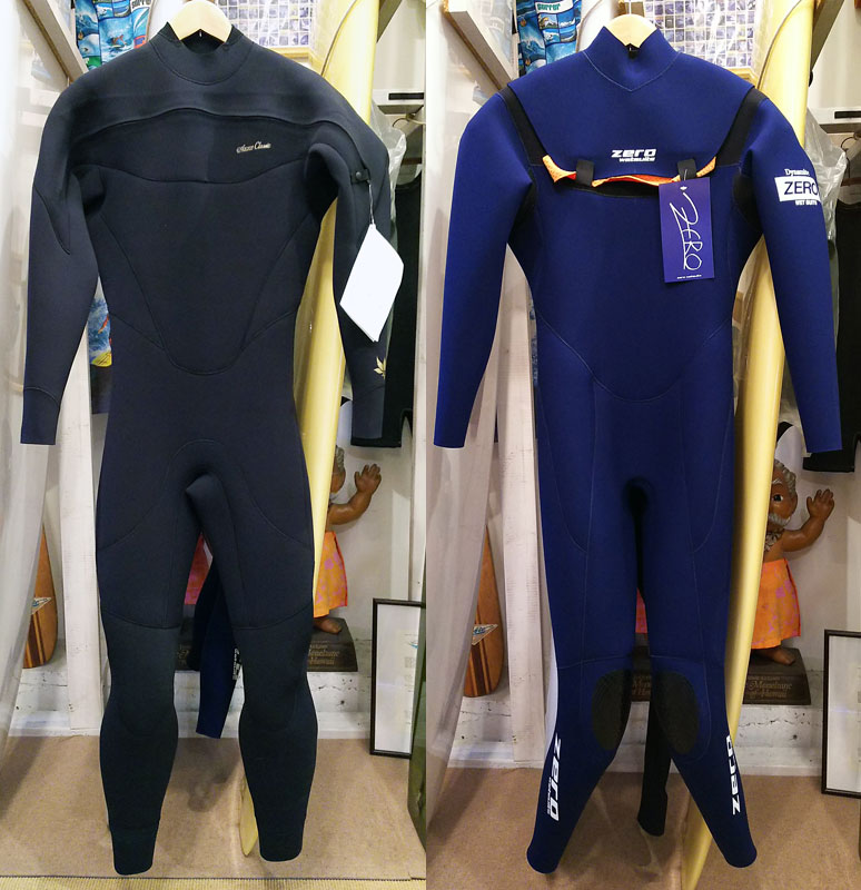 AXXEのロングチェストジップ、春秋用の3mmです。プレミアムゴールドラバー、やっぱ柔らかいです。しかも柔らかさが持続します。冬用と違って、首回りはシングルで軽くなっております(水温が低い地域の方にはダブルネックもあります)もうひとつは、ZERO。ジッパーレスの3/2mm。EXTENDのジャージの手触りはやばいです。