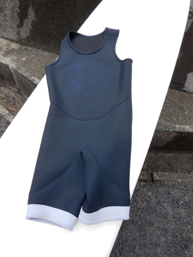 首回りと脇を広くしたのですが、そこから適度に海水が入ってきて夏でも暑くなく着られそうです。肩のベルクロも背中のジッパーもなくて、なんか開放的です。ジャージの色の組み合わせ、考えるのも楽しそうです。来年も色違いで作ってみようかと…。