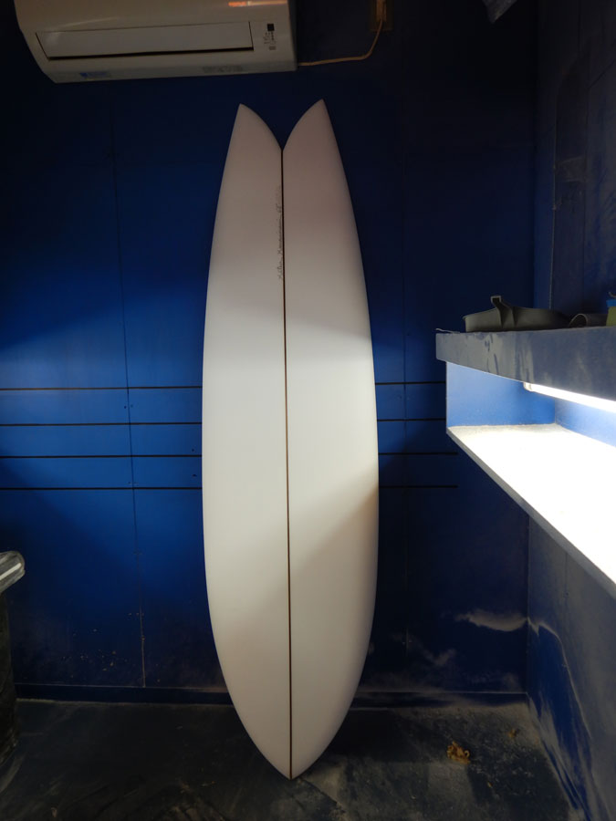 6'8"のフィッシュのシェイプが出来上がりました。グラスショップへ旅立つ直前のところをつかまえて写真を撮ってきました。いい形でしょ?