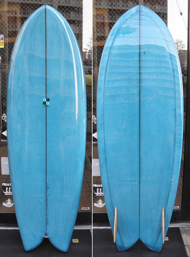 小さい方も出来上がりました。5’6”です。これはお店のストックボードなので、すぐ乗りたい方、お持ち帰りOKです。スティールブルーをイメージしたティントカラーできれに仕上がってます。フィンはダブルフォイルです。