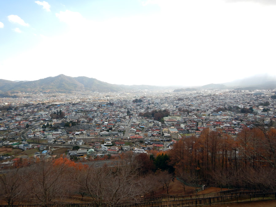 手前の街並みは、白くて細長いもので有名な富士吉田市。少し高いところから見下ろすと、どこか懐かしい雰囲気です。すぐ下は駅。列車が近づいてくると踏切が鳴り始め、ホームに着いた列車から降りた人が街の中へ散って行きます。