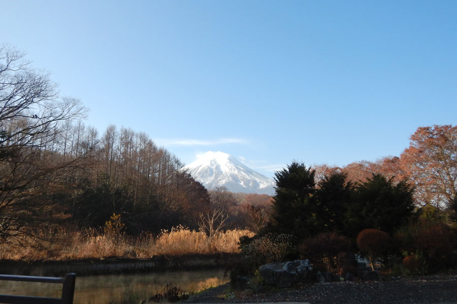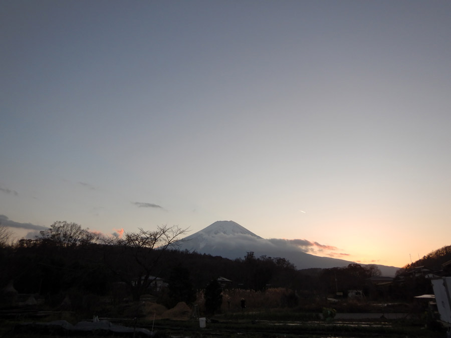 いくつかある池を見て歩いていると、冬の早い夕暮れに富士山が。