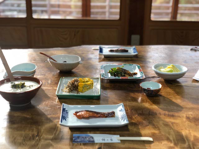 朝食はマスの粕漬。ふわふわのトロロに卵焼き。