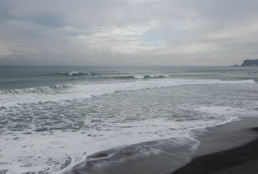 遠くの方で、もうちょいマシな感じで割れているところがあったので、そっちへロングボードでパドルしていけば、それなりに楽しめるかとクルマからボードを引っ張り出し、ワックスをゴリゴリとやって、さあ行ってみまひょーと顔を上げたらハラくらいのしっかりとしたブレイクが…。