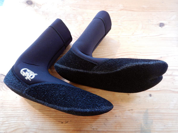 ブーツではなく、SURF GRIPのソックスです。ブーツとの違いは、ソールやかかとまわりが固めのラバーで覆われていないこと。裏は起毛のオール3㎜厚で、かかとからソール、つま先は表面が特殊加工されていて、滑り止めになっています。