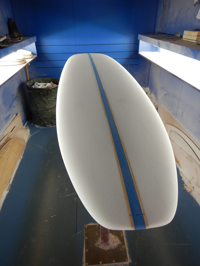 ストリンガーはこの白木の他にダークウッドを使うこともできます。カラーフォームの色はいろいろあるので、お好きな雰囲気を作ることができます。グラスオンだったら、フィンの色もフォームに合わせてカスタムOKです。このボードのフィンはフォームに合わせてブルーにしました。