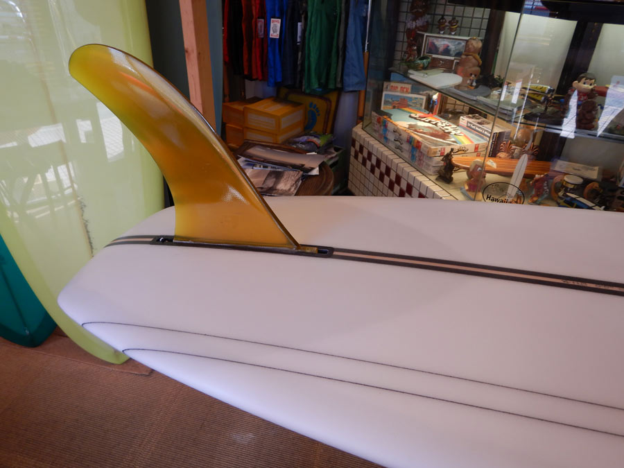 60年代の後半、サーフボードがどんどん短くなっていく直前の時代のボードによくみられるデザインです。おそらく、ジョージグリノウの影響を受けたシェイパーたちの流れを汲むデザインだと思います。ナット・ヤングが66年の世界大会で乗っていたのもこんな感じのボードでなかったかとも思われます。