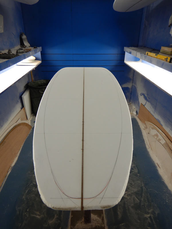 同じサイズのMINIやプリモよりもストレートなラインが増えて、速そうで走りそうな形です。ボトムはコンケーブが入って、テール付近はフラットになります(これが速いのです)。当初はバリバリのハルの予定でしたが、活さんのおススメの通りにシェイプしてもらうことにします。