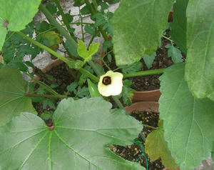 こちらは、沖縄で「ねり」と呼ばれる島オクラの花。こんなきれいな花が咲きます。花の左にちょこっと見えていますが島オクラは角がなくて丸い形をしているのが特徴です。