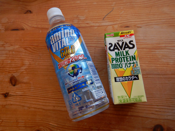 海に行くときにはこんなのを持って行きます。アミノバイタルと常温保存できるプロテインです。入る前のアミノ酸補充と上がってからの筋肉ケアです。効果があるのかどうかは不明です。プラセボでもいいじゃないですか 笑。