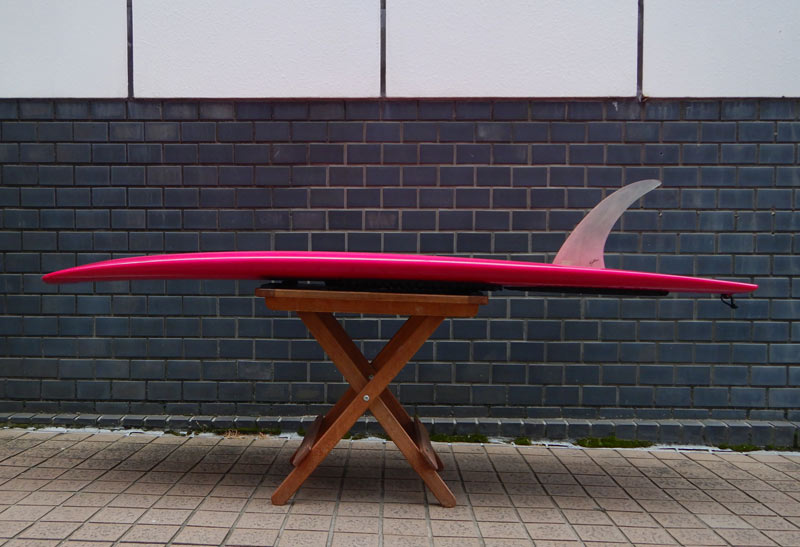プリモ8フィートです。トライプレーン(いろんな意味がありますな)コンボボトムと呼んでいるボトムです。シングルコンケーブがレールの近くまで入り、軽いアッパー気味のレールはトップにエッジが付いています。