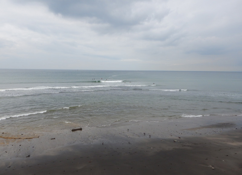 潮が目いっぱい引いたスネヒザの波。とりあえず海に入りたかったのでパドルアウトしました。しばらく続いたオフショアでカツオノエボシも沖へ流されたみたいだなあと、リサーチしながら沖へ出ます。