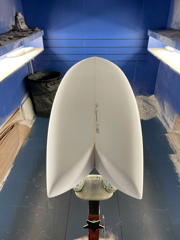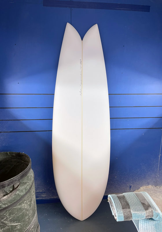 KK FISHのシェイプが出来上がりました。レングスは5’8”。ストックボードです。しかしこのアウトライン、何度見てもなんとも言えないきれいな形をしています。活さんのラウンドノーズシリーズの拡散点であり収束点でもあると言えるモデルがこのKK FISHです。