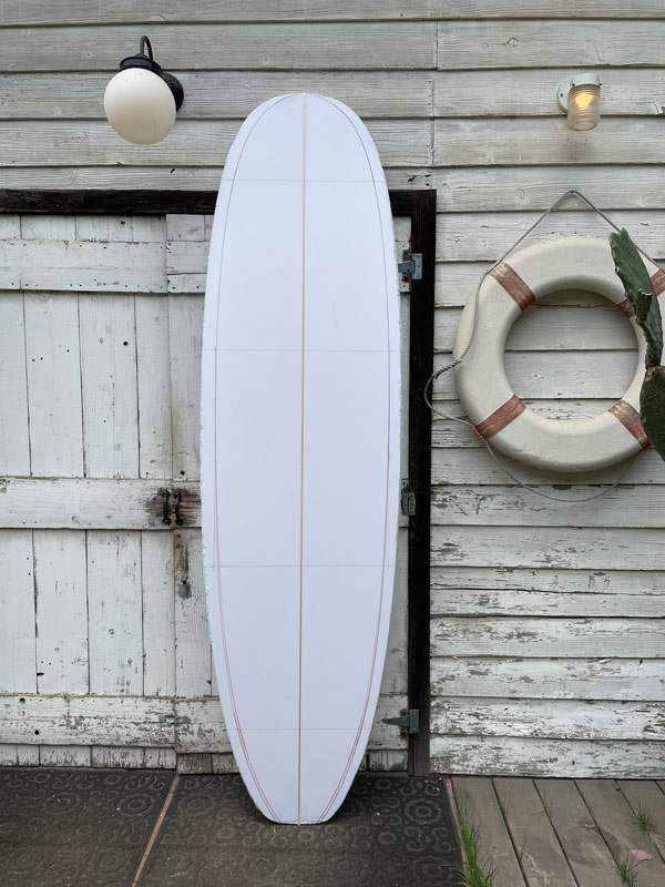 このボードは当初、8’4”でシェイプしてもらうつもりでした。でも、全体のシェイプを想像しているうちに短くなりました。レールやボトムを考えたら、このサイズくらいが自分が考えているイメージにフィットするように思えたのです。