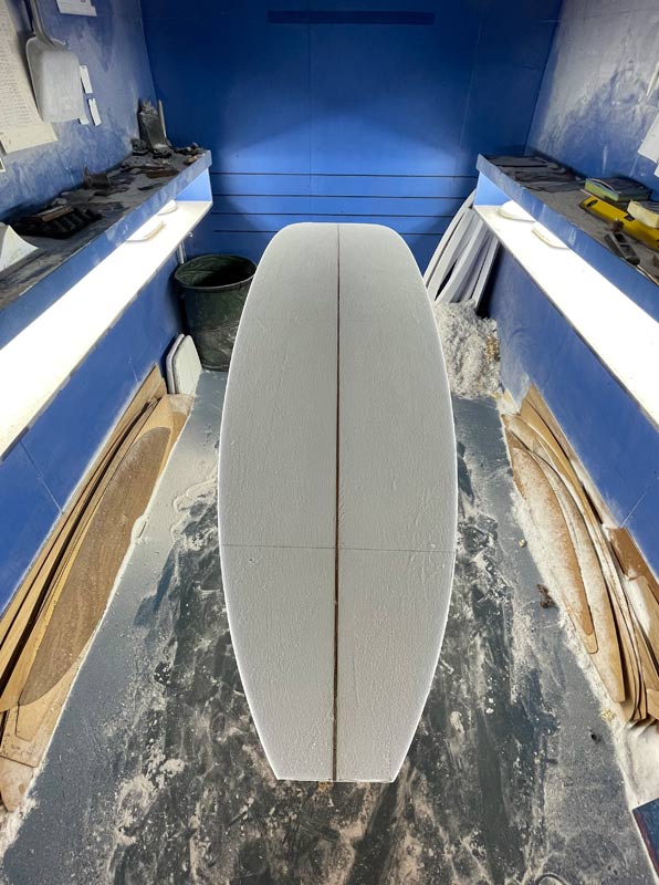 昨日はまだアウトラインまでですが、シェイプがスタートしました。まずは自分で乗るテストボードです。ポイントノーズまでは絞らず、かといってラウンドノーズのようには広すぎない絶妙なラインのノーズから、細めのスクエアテールへとスムースに繋がるこのアウトラインが大好きです。(斜めになっているのでテールは広めに見えます)