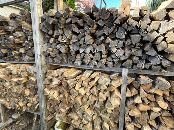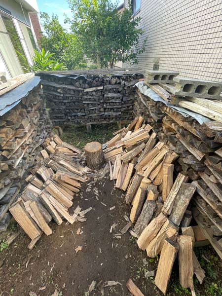 割った薪を棚に収納して完了です。上の段は3年以上乾燥させた薪です。下は割ったばかり。色が全然違うのが分かります。使うのは早くて2年後です。