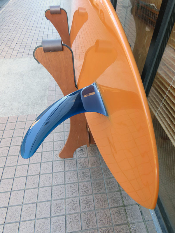 ボードのカラーとコーディネートした、ブルーティントのワンオフ製作フィンをグラスオンしました。海上がりの水滴がついたままで光が当たったら綺麗ですよ~。