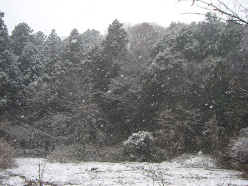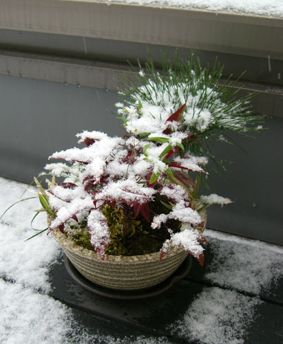 朝起きて外を見ると寒そうな曇り空。確か予報は雪のはず…またまたハズレか?と思いながらストーブに残った熾き火に薪を足し、10分ほど火の面倒を見てからふと外を見ると空から白いものがちらほらと降ってきました。雪です。見ている間にどんどん積もりだしてテラスに置いている盆栽も雪化粧です。