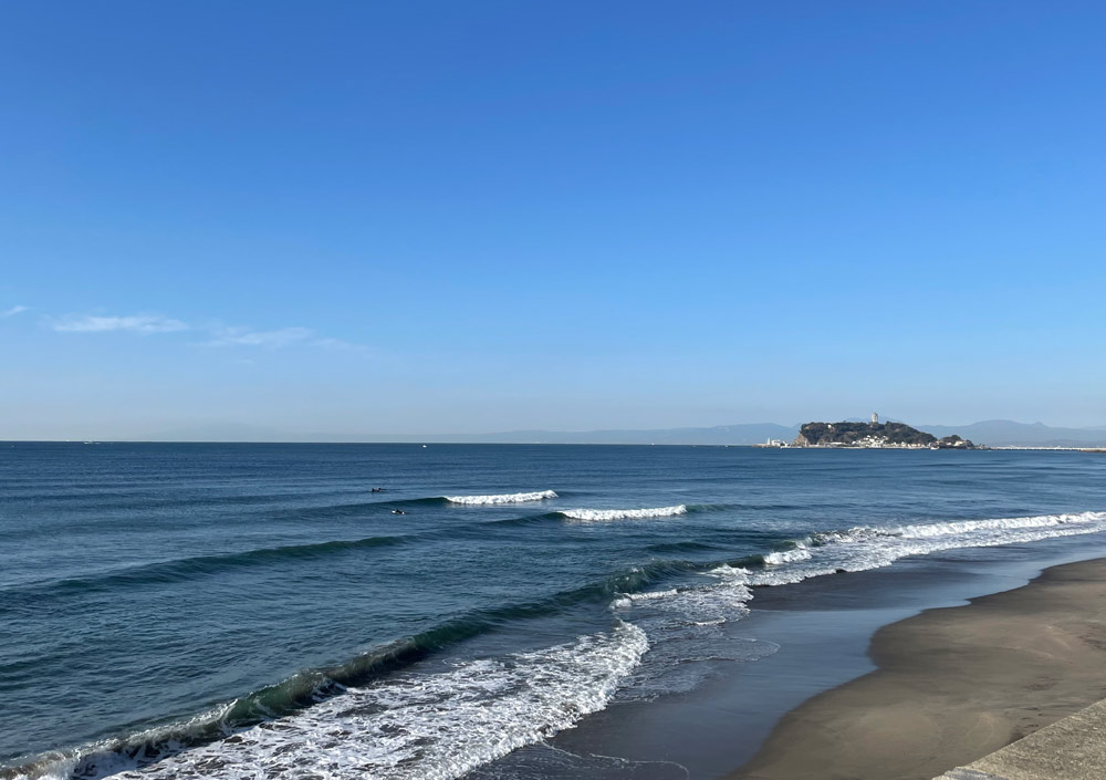 シェイプルームへ行く前の朝のひととき。潮の時間に合わせて海へ行ってみました。冬晴れの気持ちが良い空の下、小さいけれど形の良い波が崩れています。
