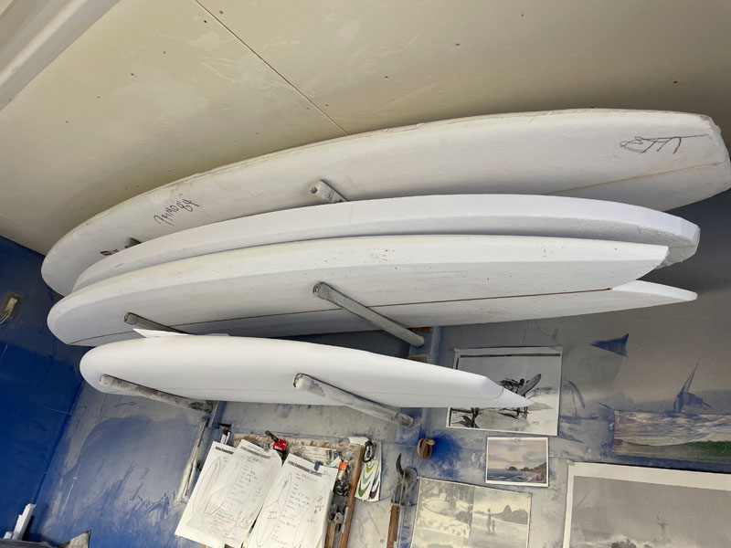 カツカワミナミサーフボードのシェイプルーム。ラックに乗っているシェイプ中のブランクスはそれぞれ個性的な顔を見せています。