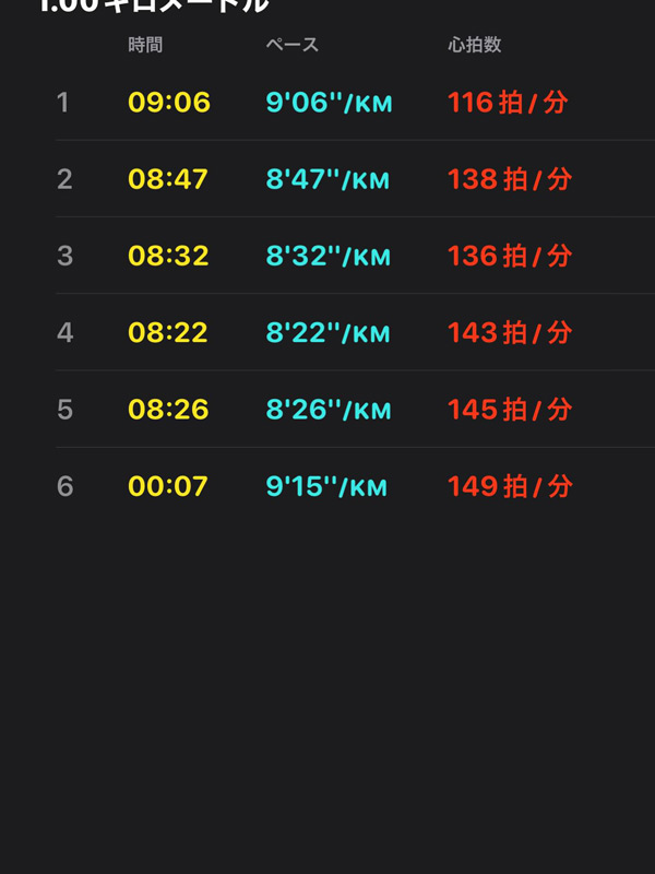 みぞおちあたりから大きく回旋を入れる意識で、脚を前に出し後方へ大きく動かすことを意識し始めたら8分32秒です。意外に簡単にイケたと思い次は脚を動かす速さ、と意識してみたら8分22秒。