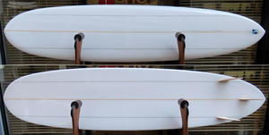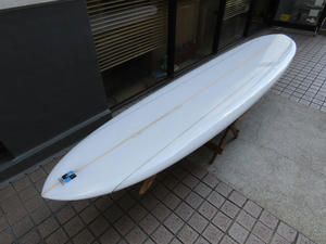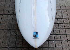 TIKIのトライフィンはオーダーボードです。グルーラインの3ストリンガーでシンプルな外観です。プライウッドをフォイルしたフィンをグラスオンしました。