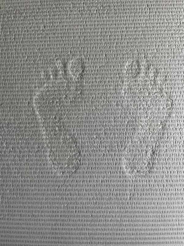 私のフットスタンプ。ピラティスマットを踏みしめて立った跡を消える前に素早く撮影しました。改善してきてはいますが、私の足の小指は寝指(何?と思ったら検索してみて)なので、跡が薄いですが足裏の三つのアーチはきれいに形作られました。