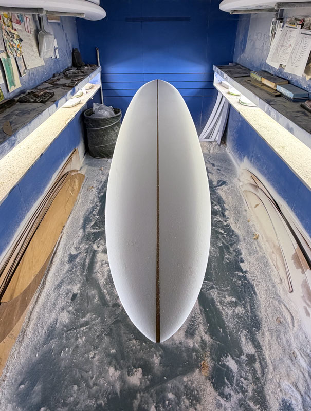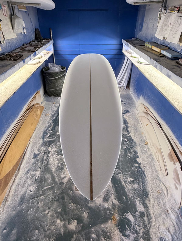 シェイプルームのラックに乗った、いくつかのシェイプの中でひと際目を引いていました。9フィート6インチでシェイプしていただいたプリモです。このサイズになってくると、グライダーと呼ぶ方がしっくりきます。