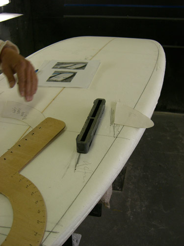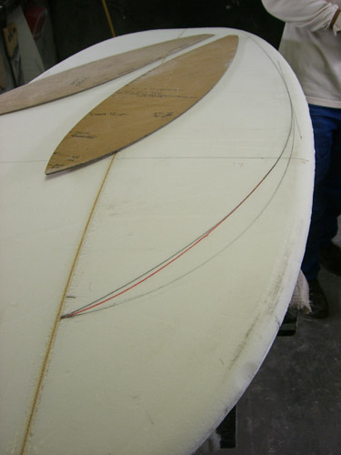 そんなこんなで、できたのがこれです。左側の赤いラインが最終的に決めたラインです。実際のフィンはフィンの部分に引いてある線より前に来ます。
