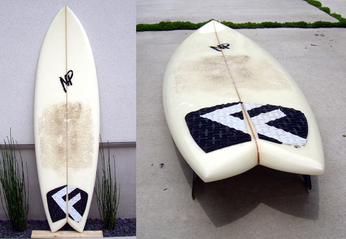 テールディメンジョンはクリステンソンがシェイプするサンディエゴフィッシュと同じくらいに広めに取られていますが、テールエンドにかけて絞り気味のアウトラインはよりマニューバを意識したシェイプのフィッシュです。フィンはフィンフェチのニールパーチェスジュニアテンプレットのフレックスするキールフィンがグラスオンされています。長さは5’8”と6’0。きれいなティントカラーでラミネートしました。