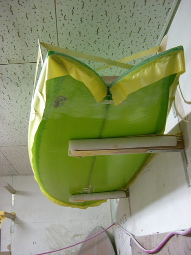 カツさんのスタビーボード。これで2本目です(折れたロングのリメイクを入れれば3本目です)どっちがノーズでテールか判らないディメンジョンですがフィンが付いているほうが後ろのようです。グラスオンでフィンを固定してしまったのは二本目の自信。