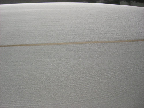シェイプ中のフォームの表面。電動ではないカンナだけを使ってノーズからテールへ、テールからノーズへと大きく大きく流れるようにフォームを削っていきます。ボトムのコンケーブもこうやってシェイプしていくと、まるで水の流れが見えてくるように感じてしまいます。出来上がってしまうと見ることができない制作途中のサーフボードの美しい瞬間です。