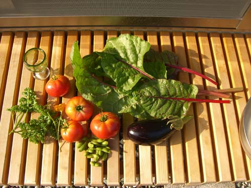 これから晩飯です。材料はさっき畑でとれた野菜。今日の冷たい一品はアボカドのスープを作ってみようと思ってます。それとパスタです。