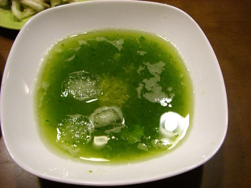 味付けは和風。カツオでダシをとって、薄口しょうゆと塩で味付け。冷蔵庫でよーく冷やしてからキュウリをすりおろして加えます。おろししょうがを乗せてできあがり。一杯でキュウリ一本が分量の目安。少し濃い目に味付けをしておけば氷をいれても冷たく美味しくいただけます。キュウリは体温を下げる効果があるので暑い日にはぴったりのスープです。洋風でもいけそう。