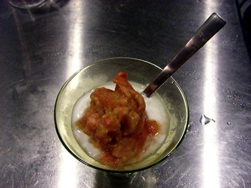 ヨーグルトの上に凍らせたトマトをすりおろして乗せるだけ。それだけですが甘酸っぱくて、大人の味のデザートの出来上がり。お試しください。