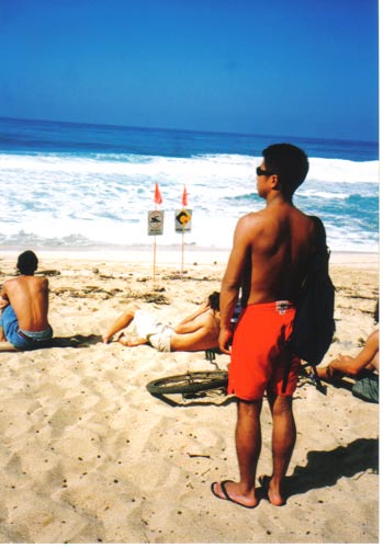 この日は大きいウエストスウェルが入っていて、沖のセカンドリーフから割れてくるヒュージパイプに圧倒されて立ちすくんでいるところです。