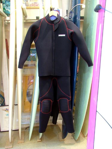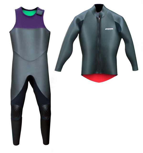 STEAMERさんは今期からジャージをハイパーネッスルというジッパーレスの首回りによく使われている高伸縮性の素材を使用しているんですが、これマジメに良さそうです。スキンのネッスルよりも柔らかくて、グーンと延びてその上これ、かーなり軽いです。ロングジョンとジャケットの組み合わせでこの軽さだからフルスーツにしたらもっともっと軽くなると思います。