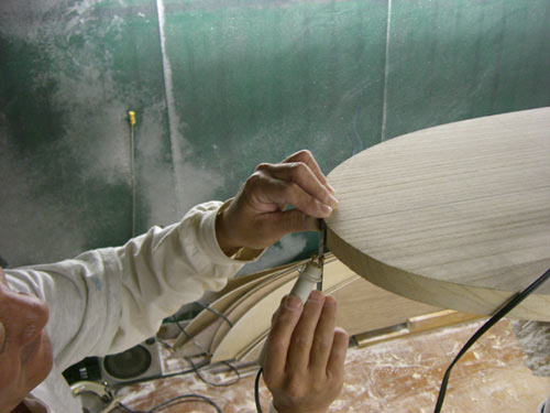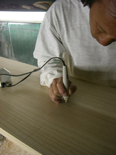 要所、要所に熱線を使って焼印を入れていきます。まずはノーズ。木が焦げるいい匂いが煙とともに立ち昇っていきます。