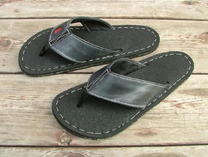 ソールは古タイア。丈夫で履物のソールにはこれ以上のものは無いかもしれません。表側はタイヤを細かく切ったものを固め足乗せの感触を柔らかくしています。ストラップは自転車のチューブですが、これが上手になめされた革みたいな雰囲気でいい質感をかもし出しております。ソールを縫い合わせているステッチはヘンプ。