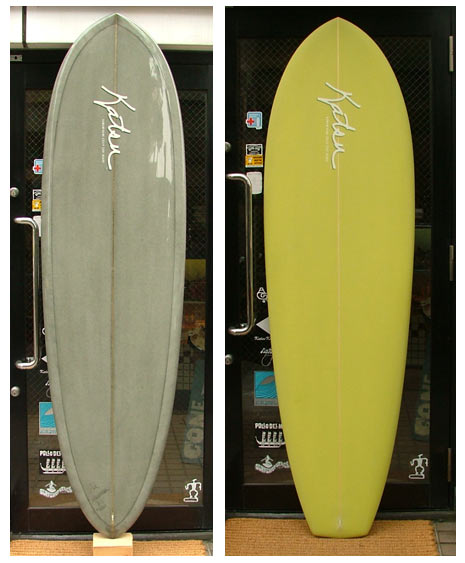1本はトライフィンのカスタムMINI。オーダーされた方の愛車のカラーに合わせてきれいなグレイのティントに仕上げました。もう1本はMINIをベースにダイアモンドテールにアレンジされたハル・スタビーです。くすんだイエローのブラシカラーでウェットサンディング仕上げです。