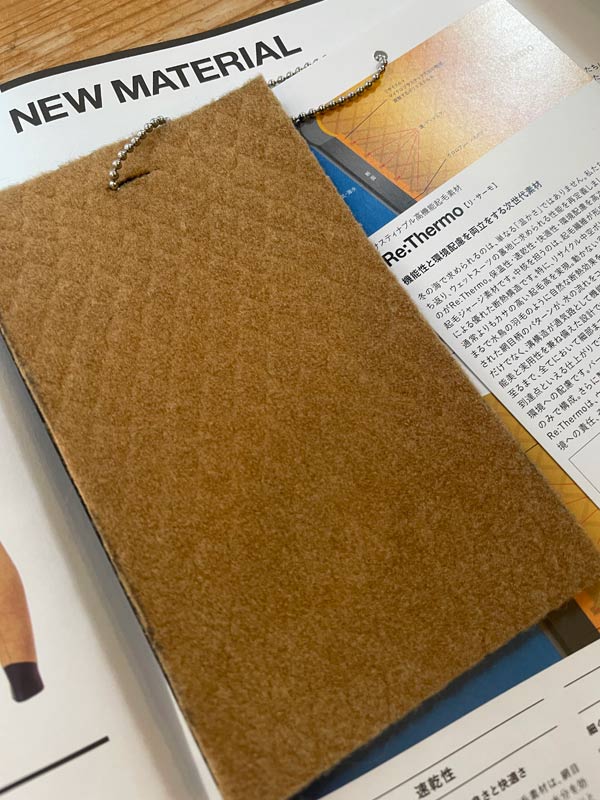 今回は全体のカットとマテリアルをリニューアル。裏地にはこれまでのサーモブラックに変わって、リサイクルポリエステルとマイクロプラスチックの流出汚染に配慮し、速乾性、伸縮性にも優れた高い保温断熱効果を持つ次世代素材の「Re:Thermo」を使用しています。