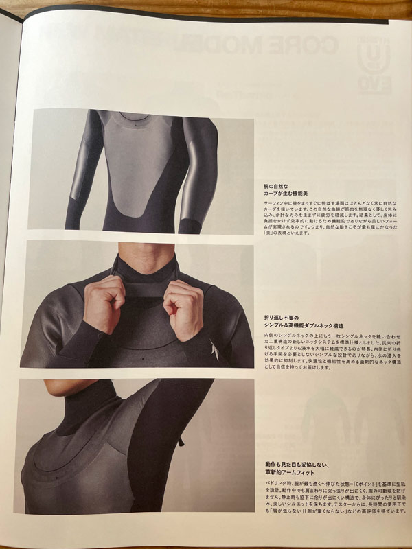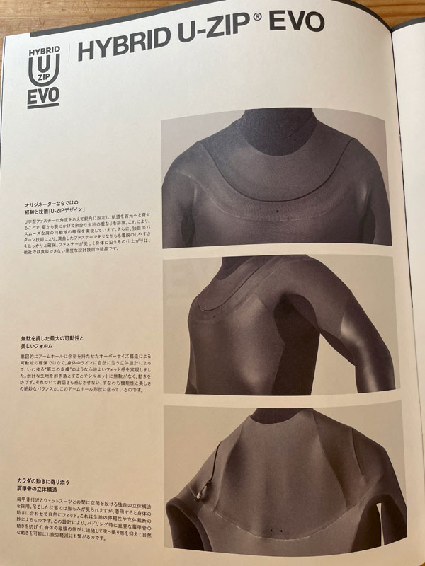 U-ZIP EVO、実物を見せていただきました。先日のブログはカタログを見て書いたのですが、実際に手にしてみるとカタログだけでは分からなかった部分、合理的な造形やウェットスーツとしでの機能へのこだわりから生まれた、モノとしての存在感を持ったウェットスーツだと実感しました。