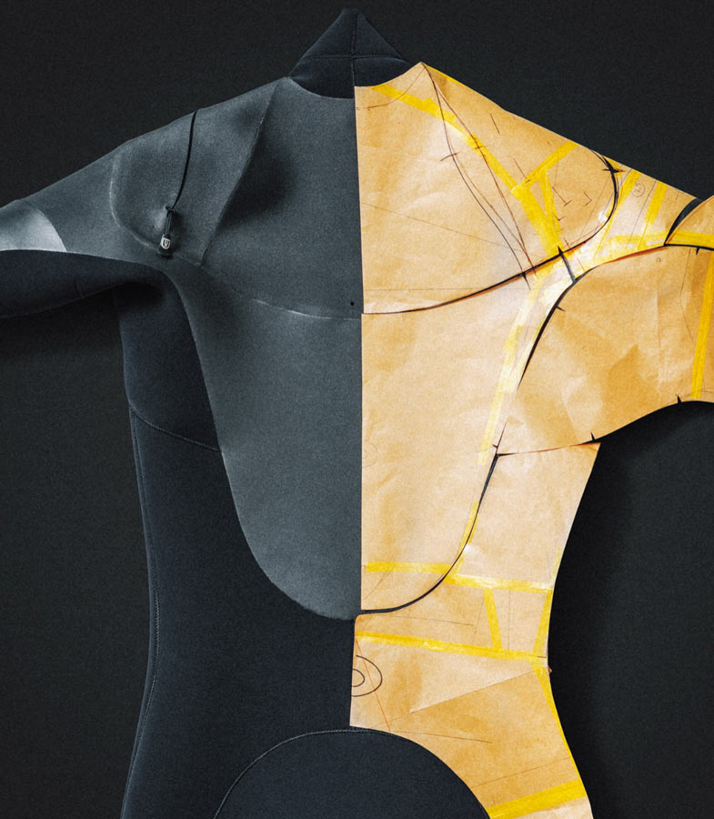 ウェットスーツの型紙はサーフボードで言えばテンプレットのようなもの。テンプレットと違うのはすでに三次元的要素が組み込まれている点です。(よーく見ると、切る貼るということを繰り返したと思われる修正の跡が無数にあります)